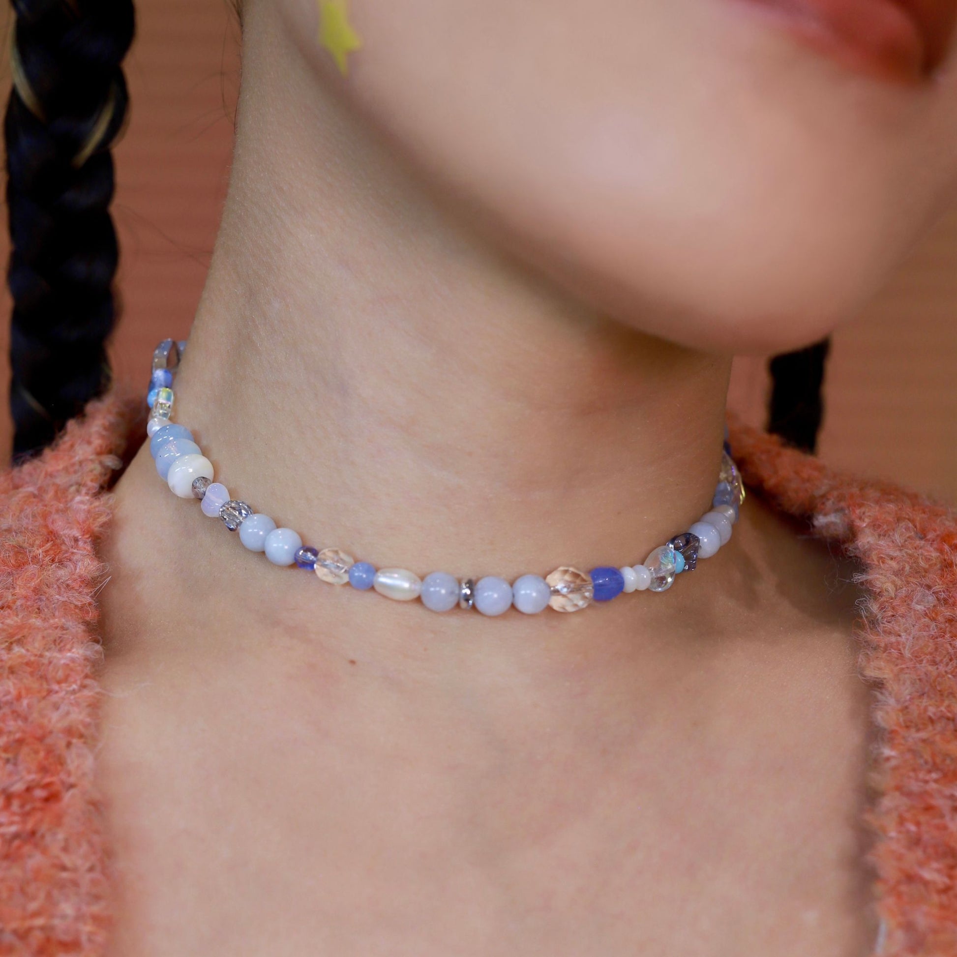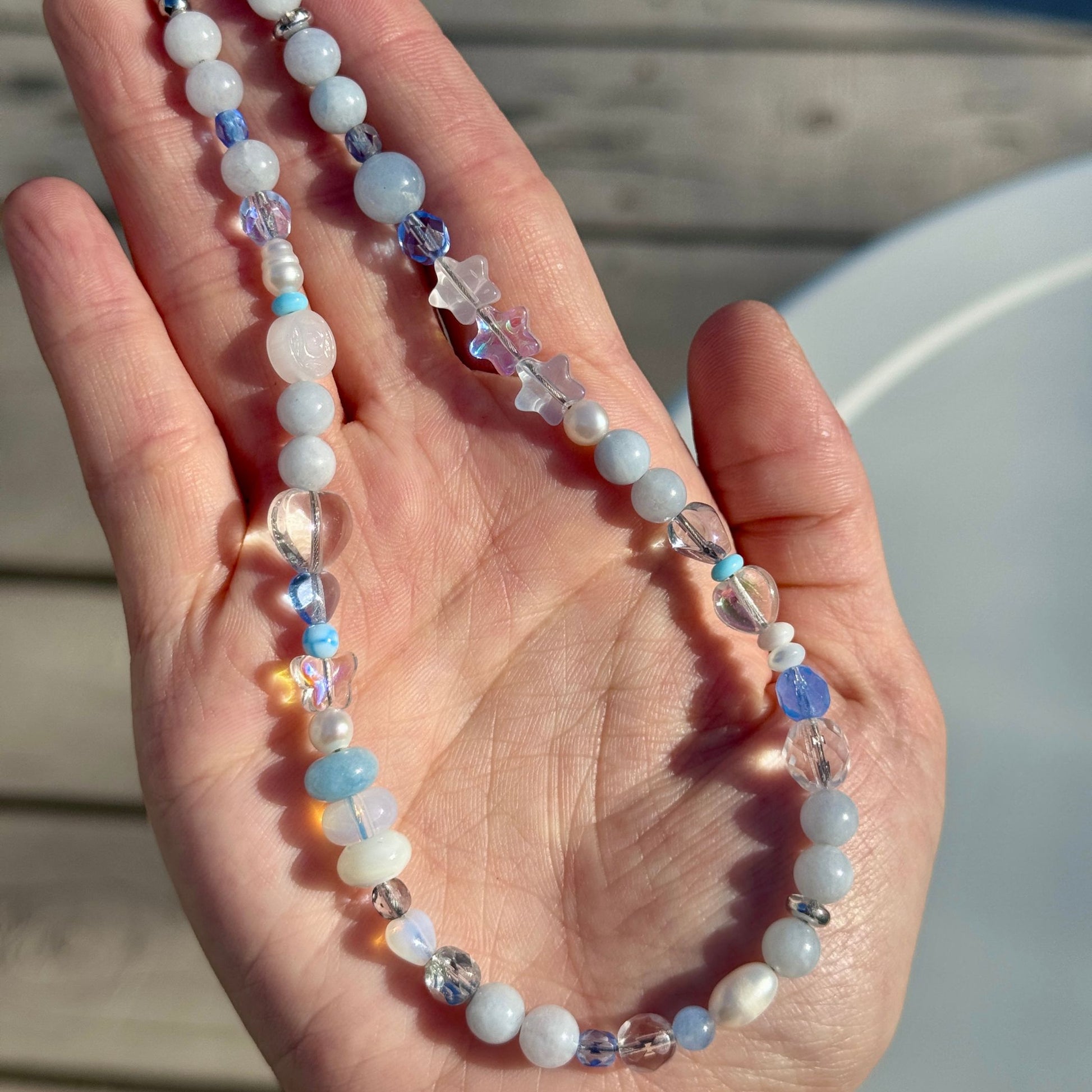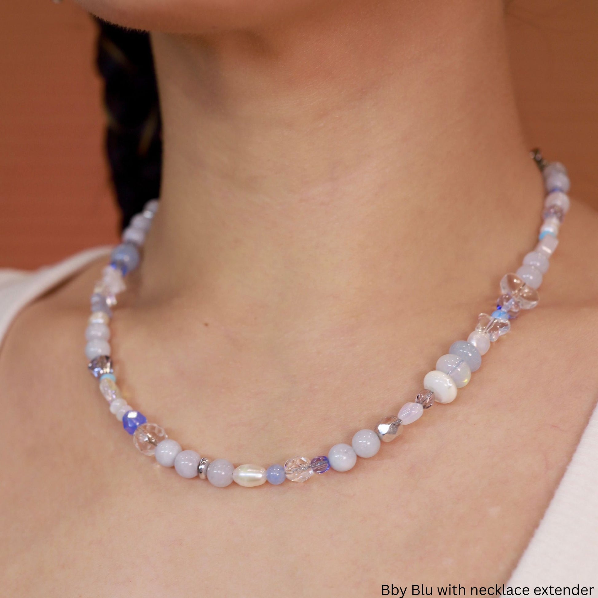Bby Blu contains some of the most beautiful beads in my collection - dyed jade, opalite, aquamarine, & mother of pearl beads, freshwater nugget + rice pearls, a variety of vintage Czech glass beads, & the cutest little butterfly to boot! The wire, clasps, & findings are all stainless steel.