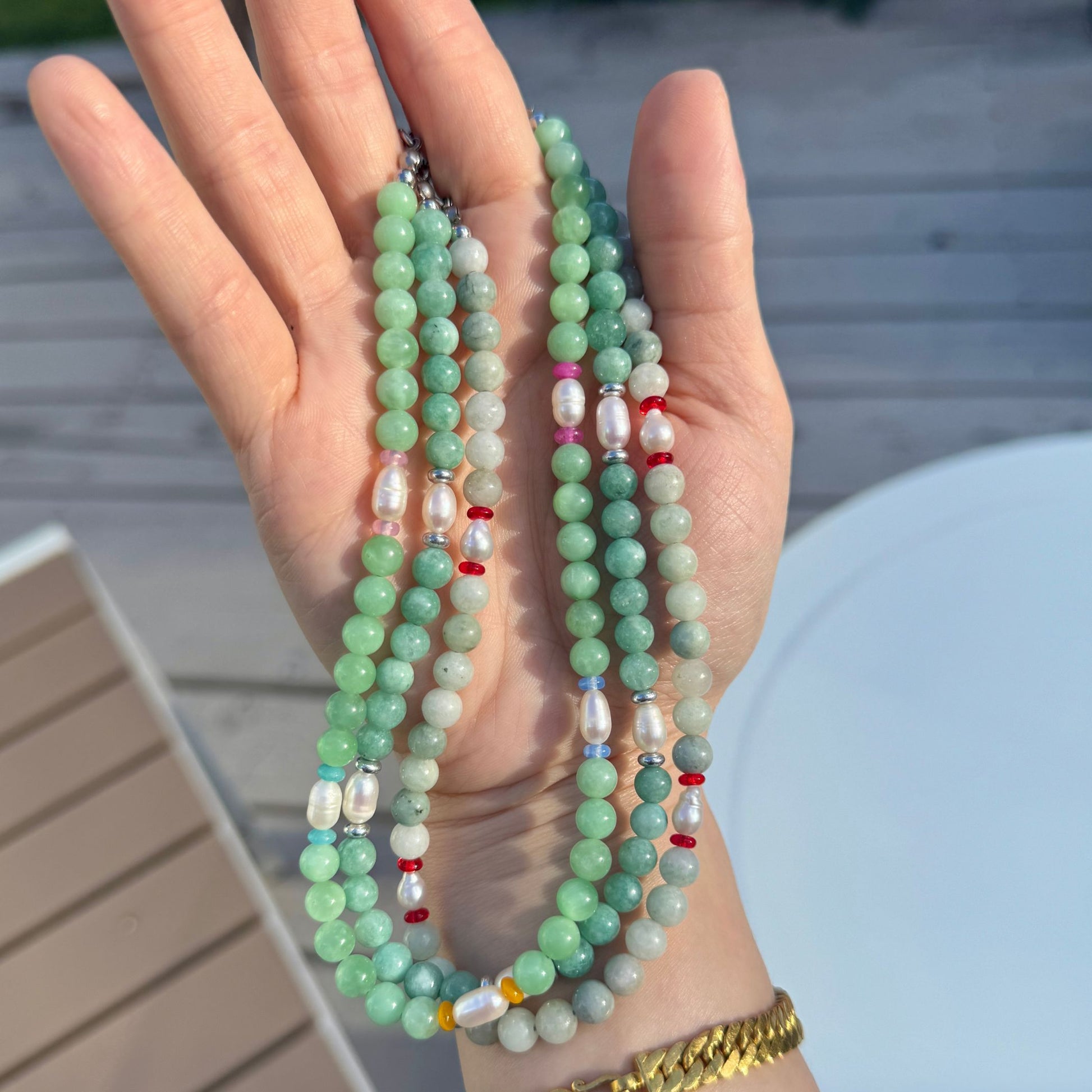 The jade used in this design is actually what popped off my obsession with semi-precious stone beads. It is my favorite color and tone of jade and in many of the beads, there’s an almost moonstone opalescence. I ended up purchasing all the stock the store had because I never wanted to be without them (& have coveted them for years)... but alas, I couldn’t NOT use these beads for this design. That means this one is a limited run in terms of the jade AND the freshwater rice pearls so if you like this design, don’t hesitate!