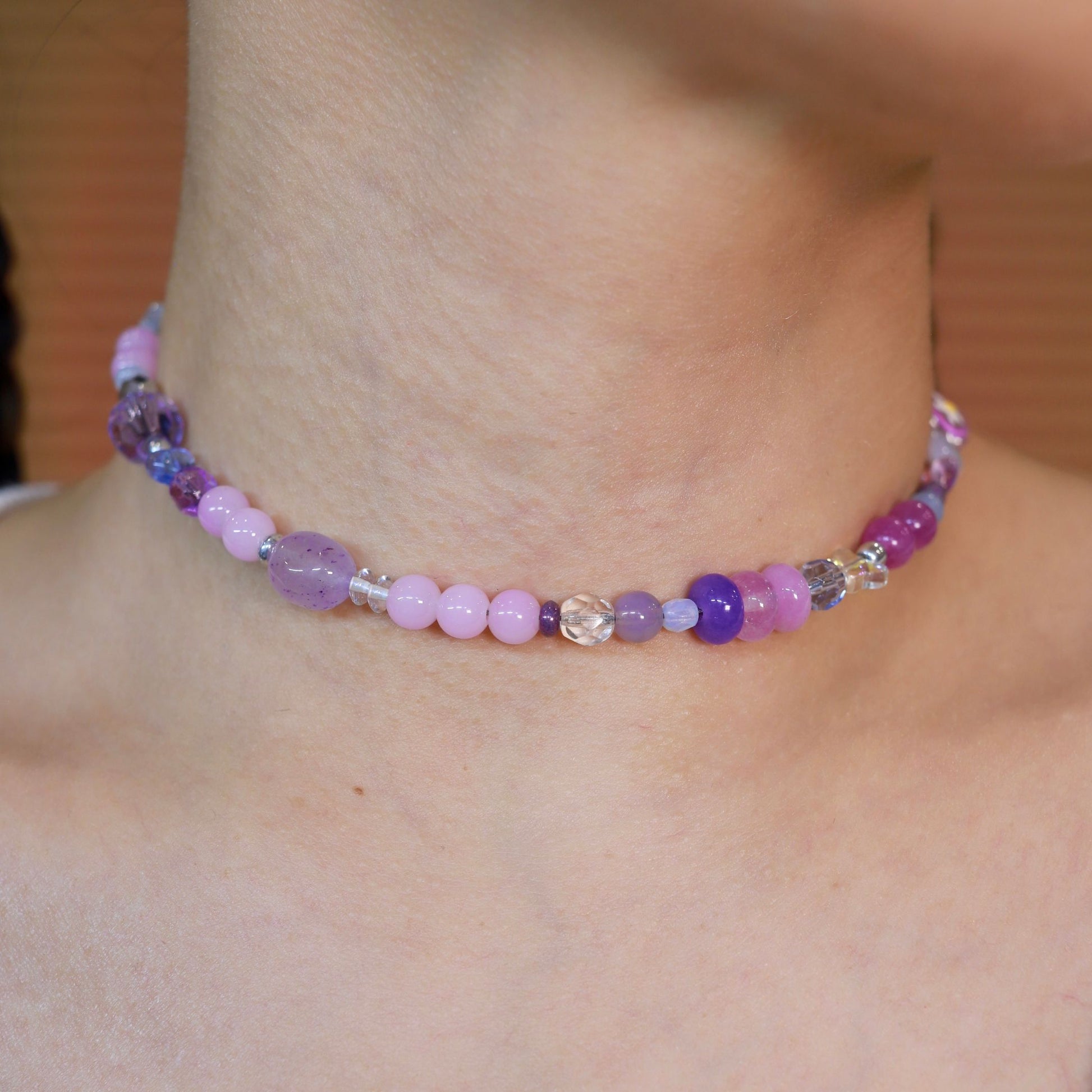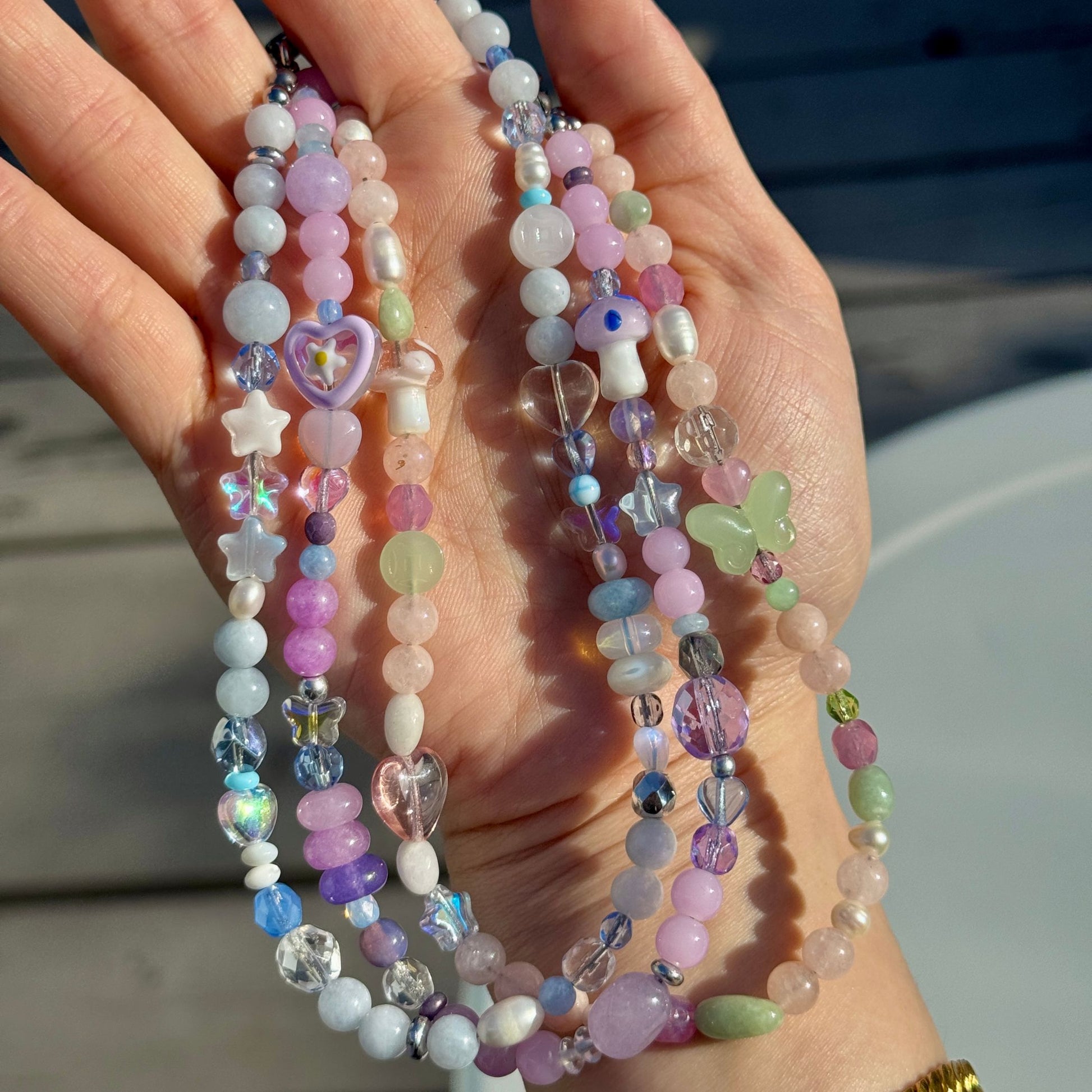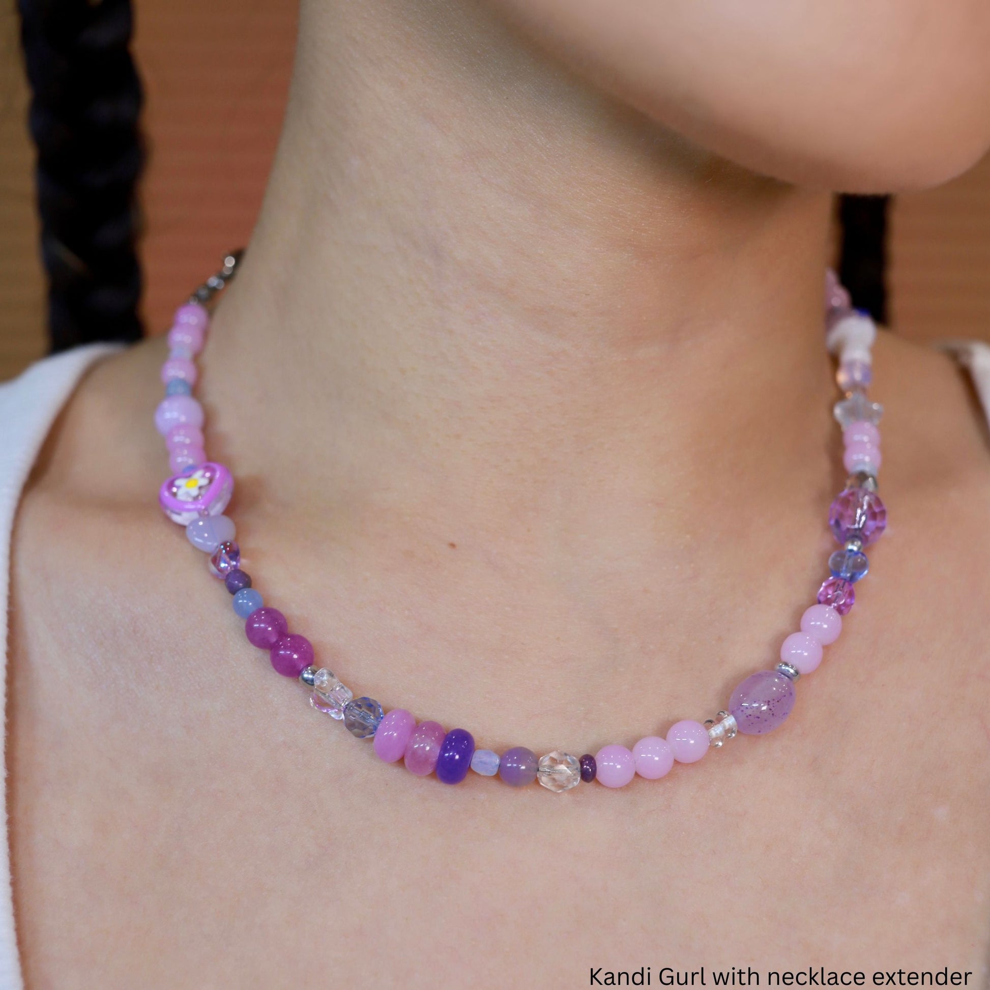 There’s something about these purples & blues… I find myself just staring at this one the most! Kandi Gurl contains a variety of vintage Czech glass beads, dyed jade, opalite, & kunzite, and two lampwork glass beads (note: the large heart + daisy bead comes in 2 shades of purple at random). The wire, clasps, & findings are all stainless steel.